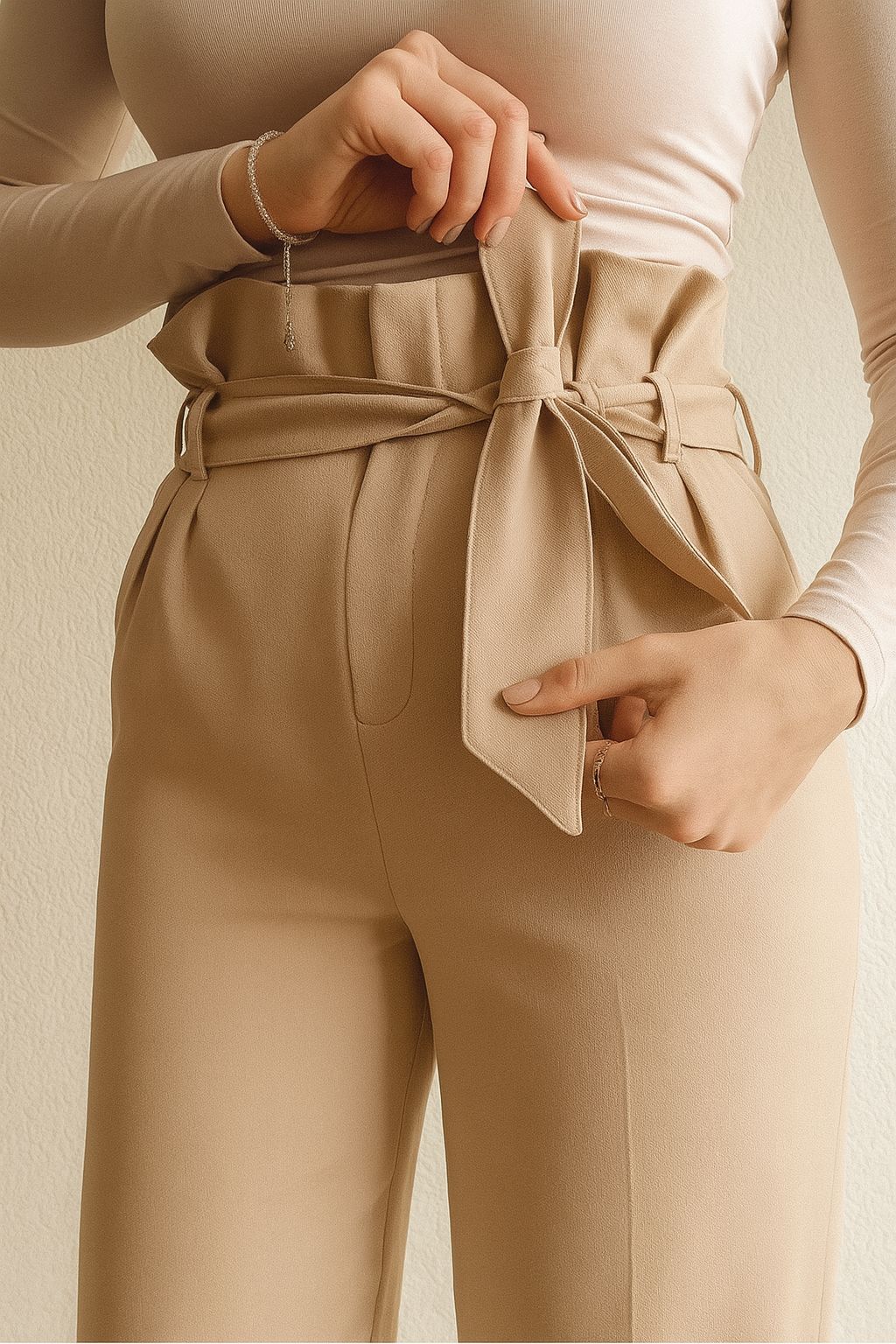 Taille haute, coupe raffinée et détail ceinture signature.