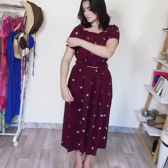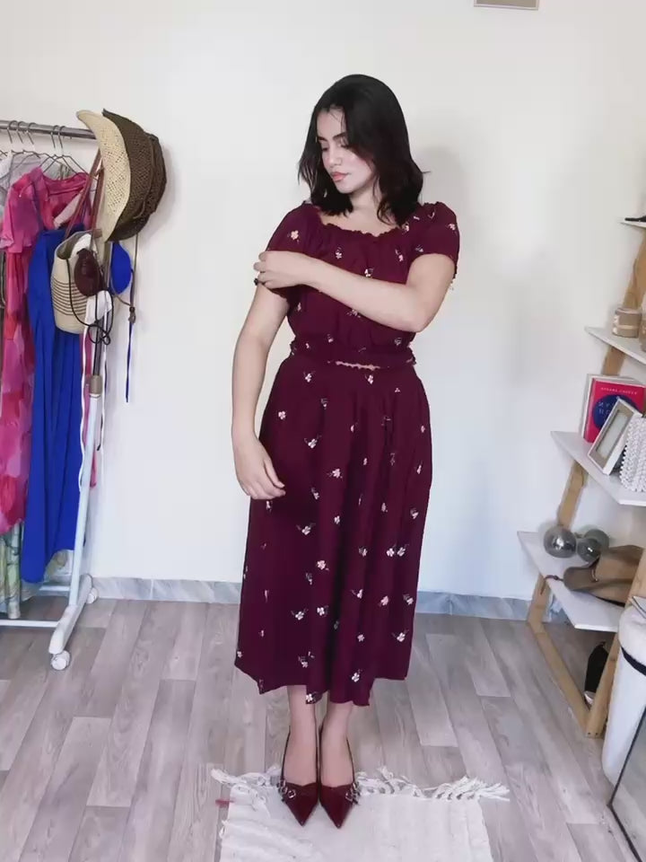 Composé d’un top épaules dénudées et d’une jupe fendue à la taille ceinturée, il met en valeur la silhouette tout en restant confortable. Les détails imprimés apportent une touche de charme supplémentaire.