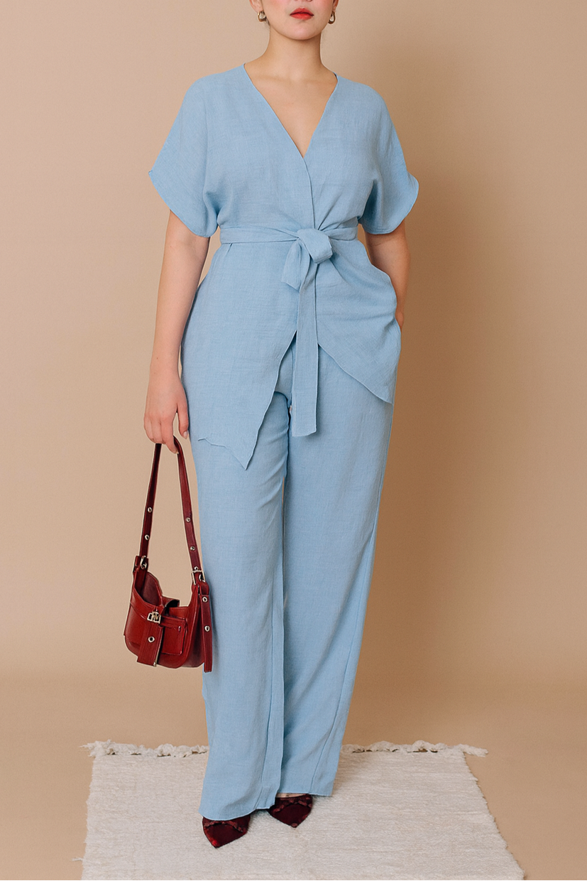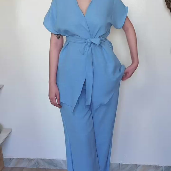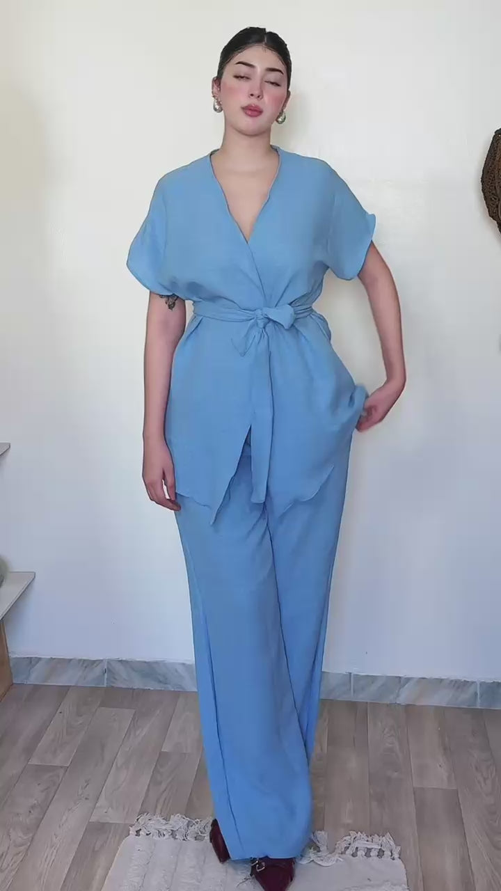 L'ensemble 2 pièces est conçu de manière à pouvoir être porté séparément. Vous pouvez associer le kimono avec votre jean préféré et des talons ou l’associé avec le pantalon en lin.