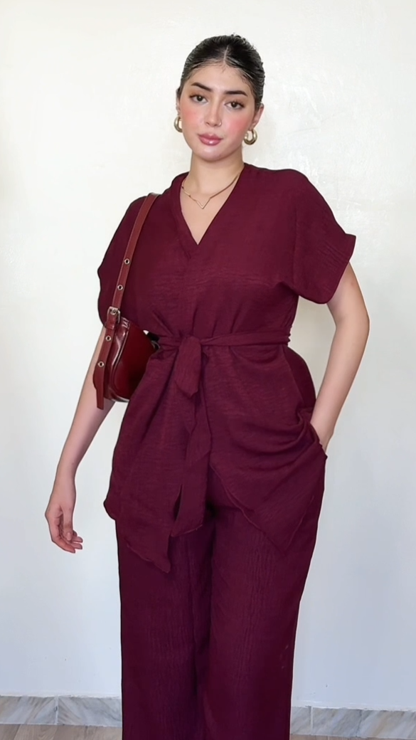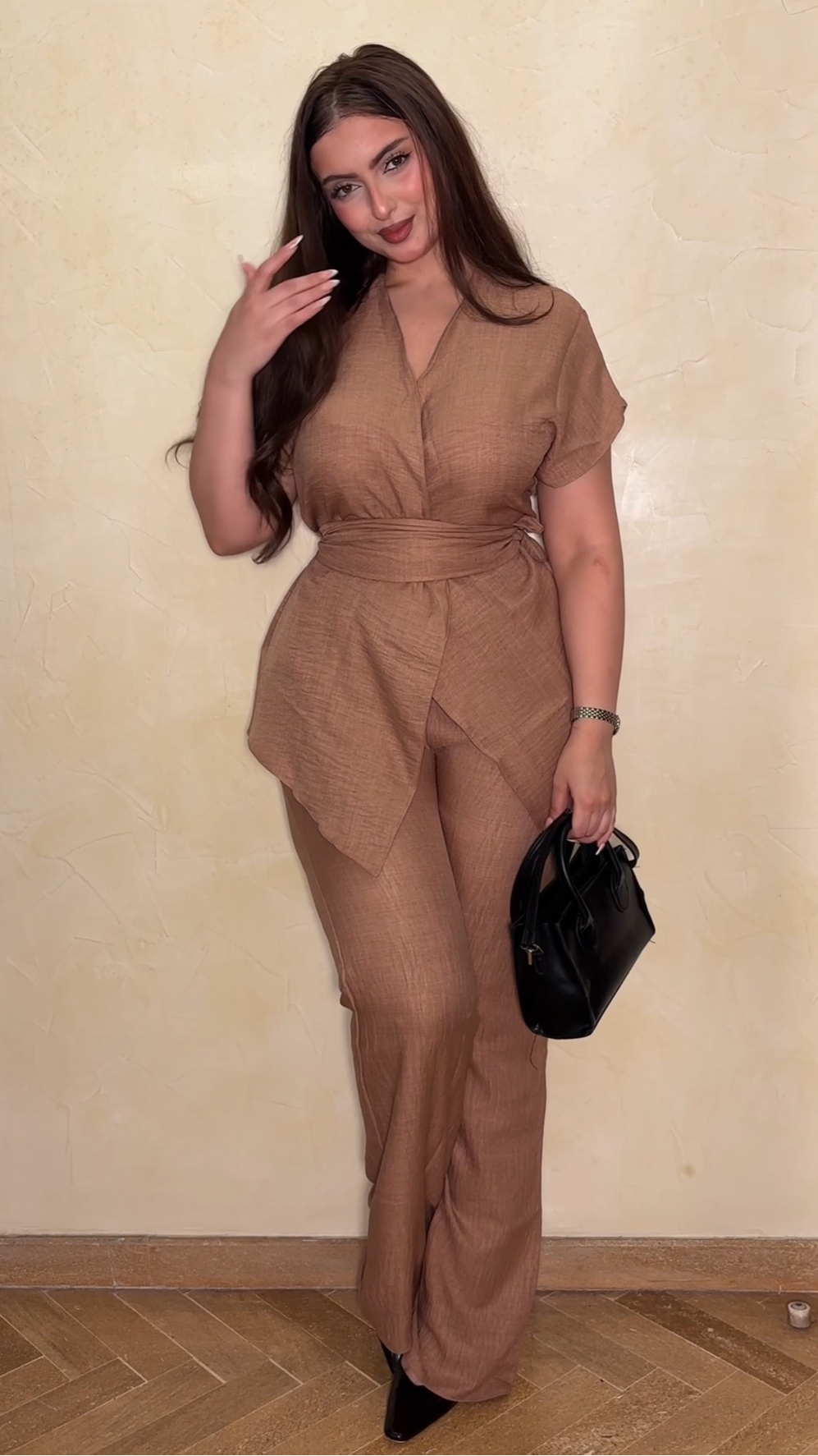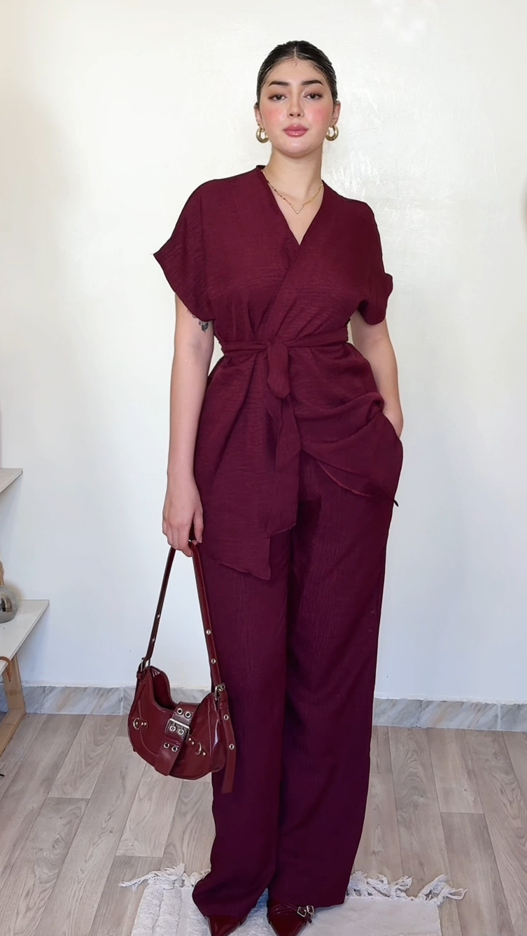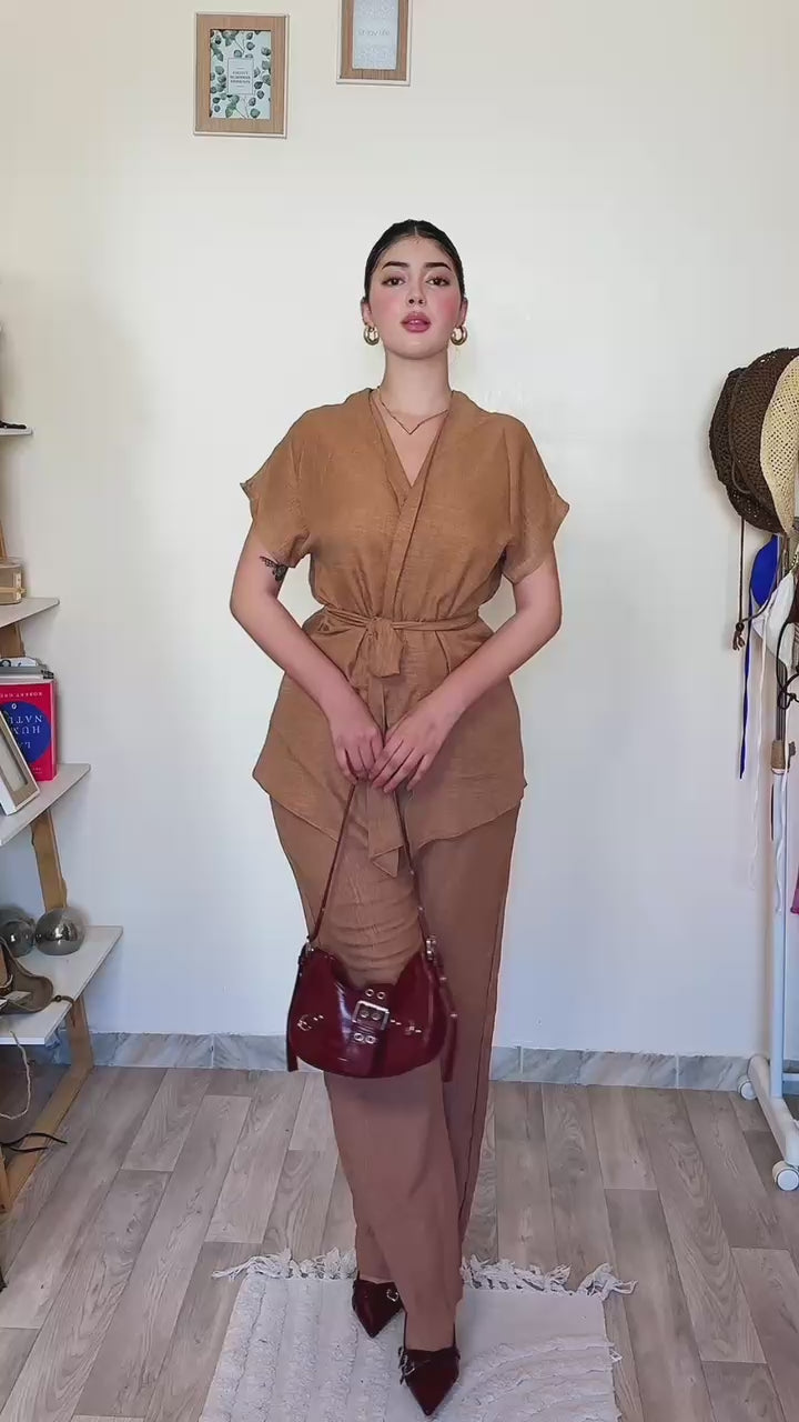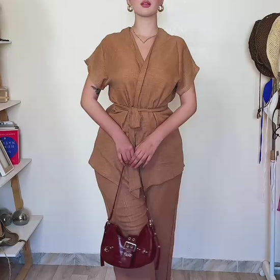 L'ensemble 2 pièces est conçu de manière à pouvoir être porté séparément. Vous pouvez associer le kimono avec votre jean préféré et des talons ou l’associé avec le pantalon en lin.